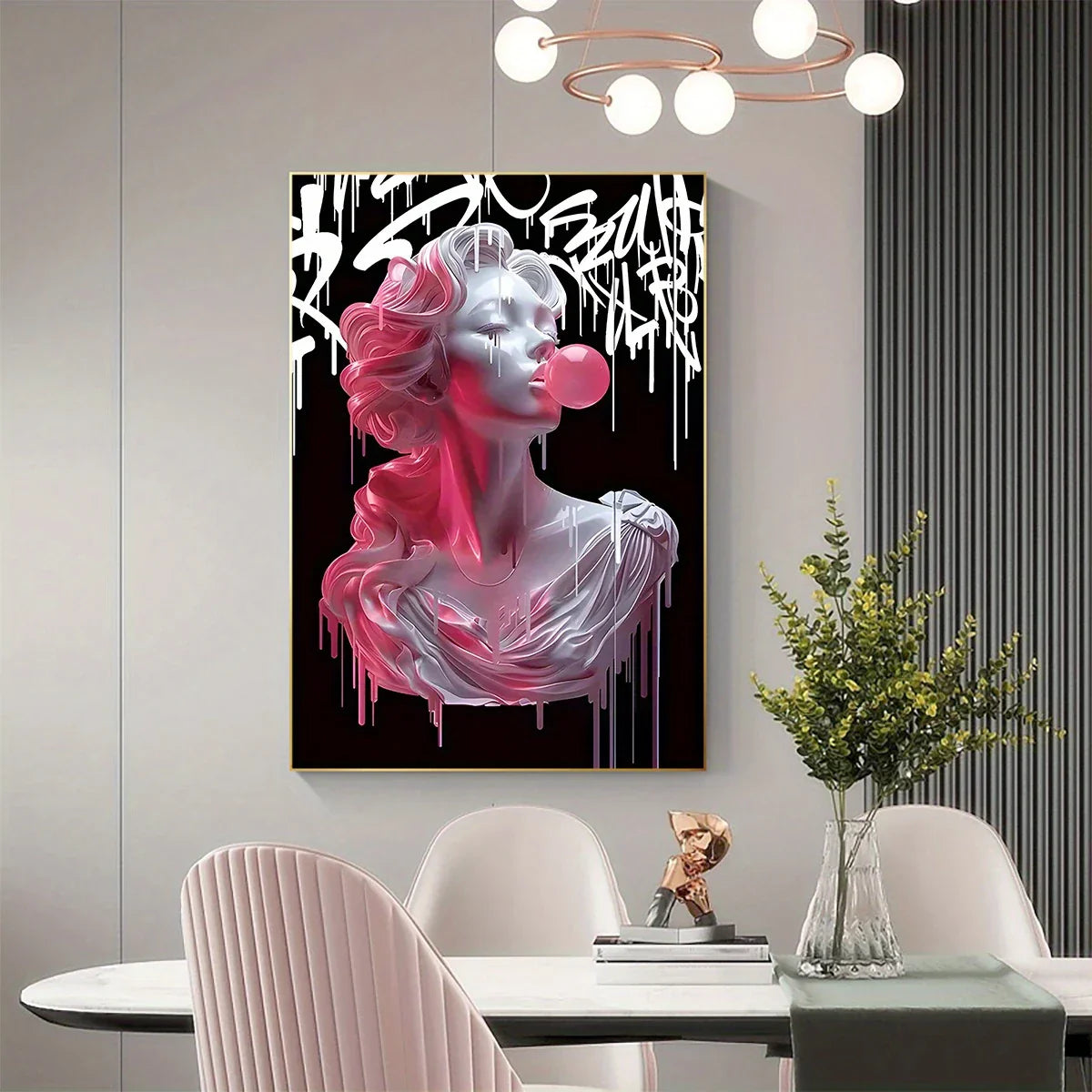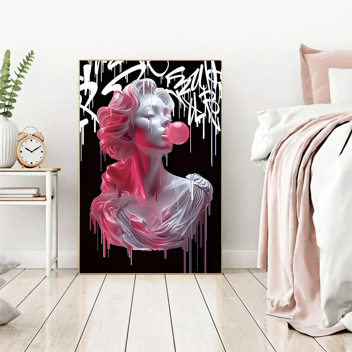 Bring a bold fusion of classical elegance and urban edge into your space with "Neo-Classical Rebel". This striking artwork reimagines a Greco-Roman bust in modern street style, complete with bubble gum pop and dripping graffiti overlays. Set against a stark black background, the contrast of timeless sculpture with contemporary attitude makes this piece a powerful statement in any room.